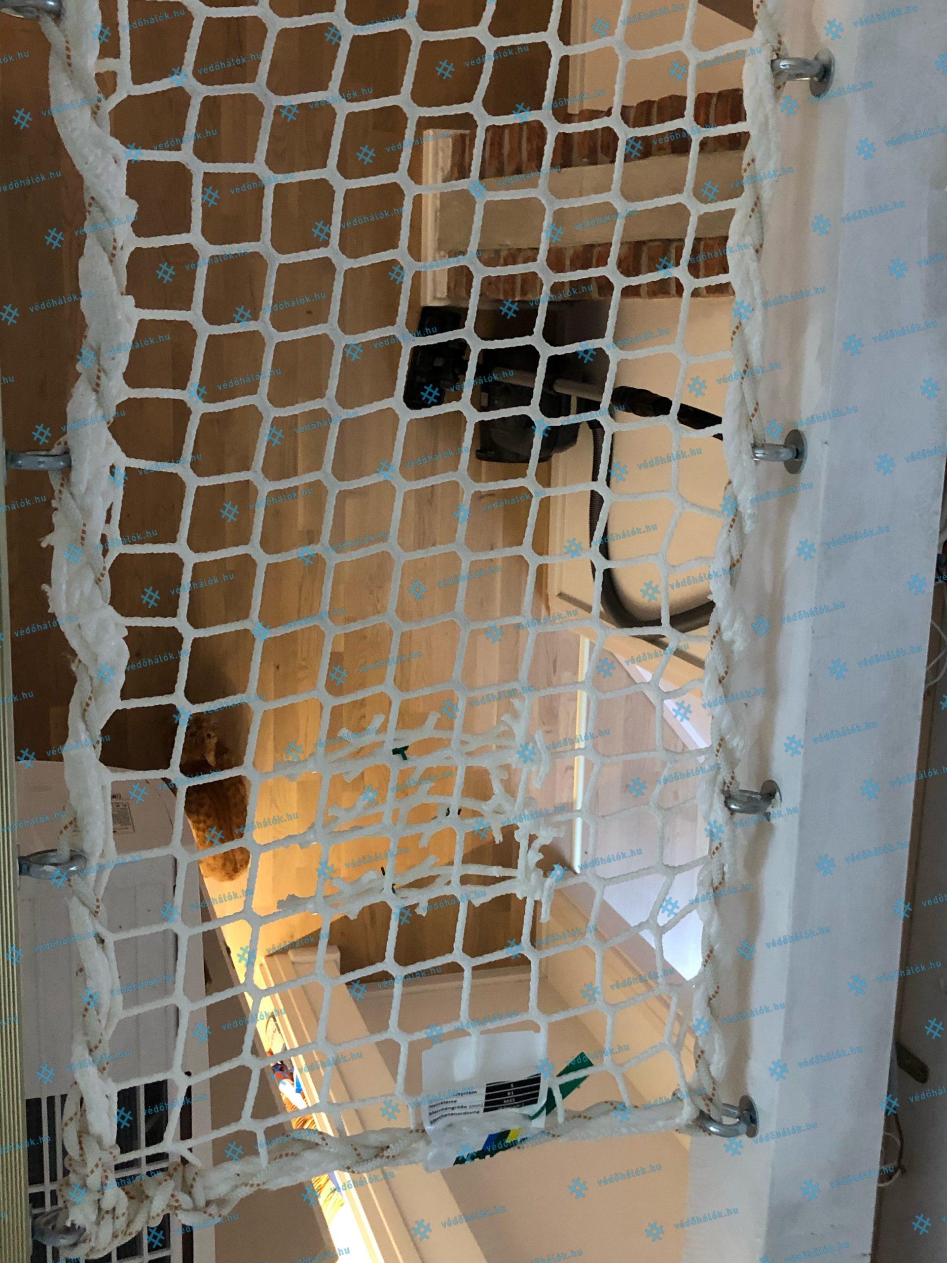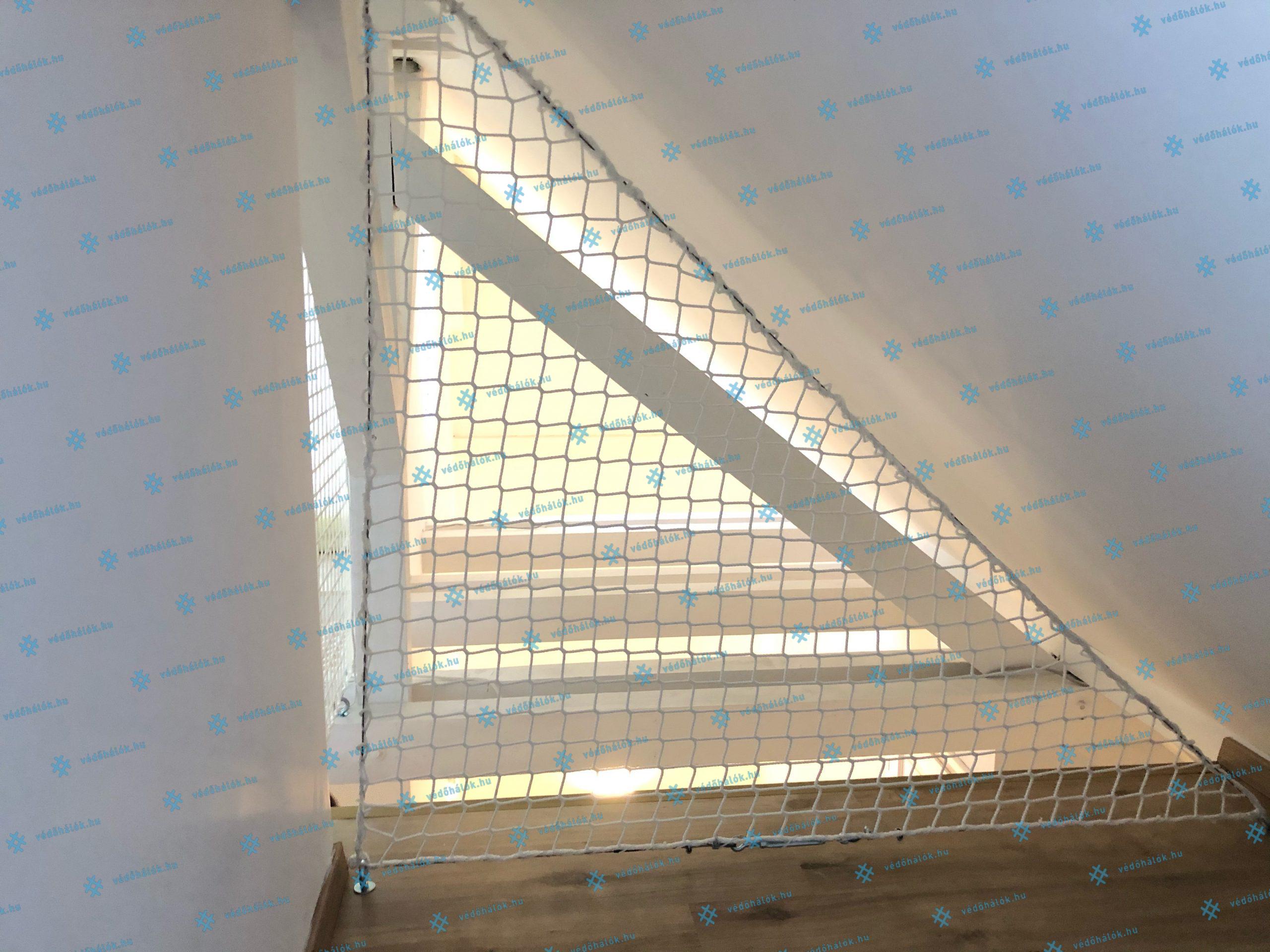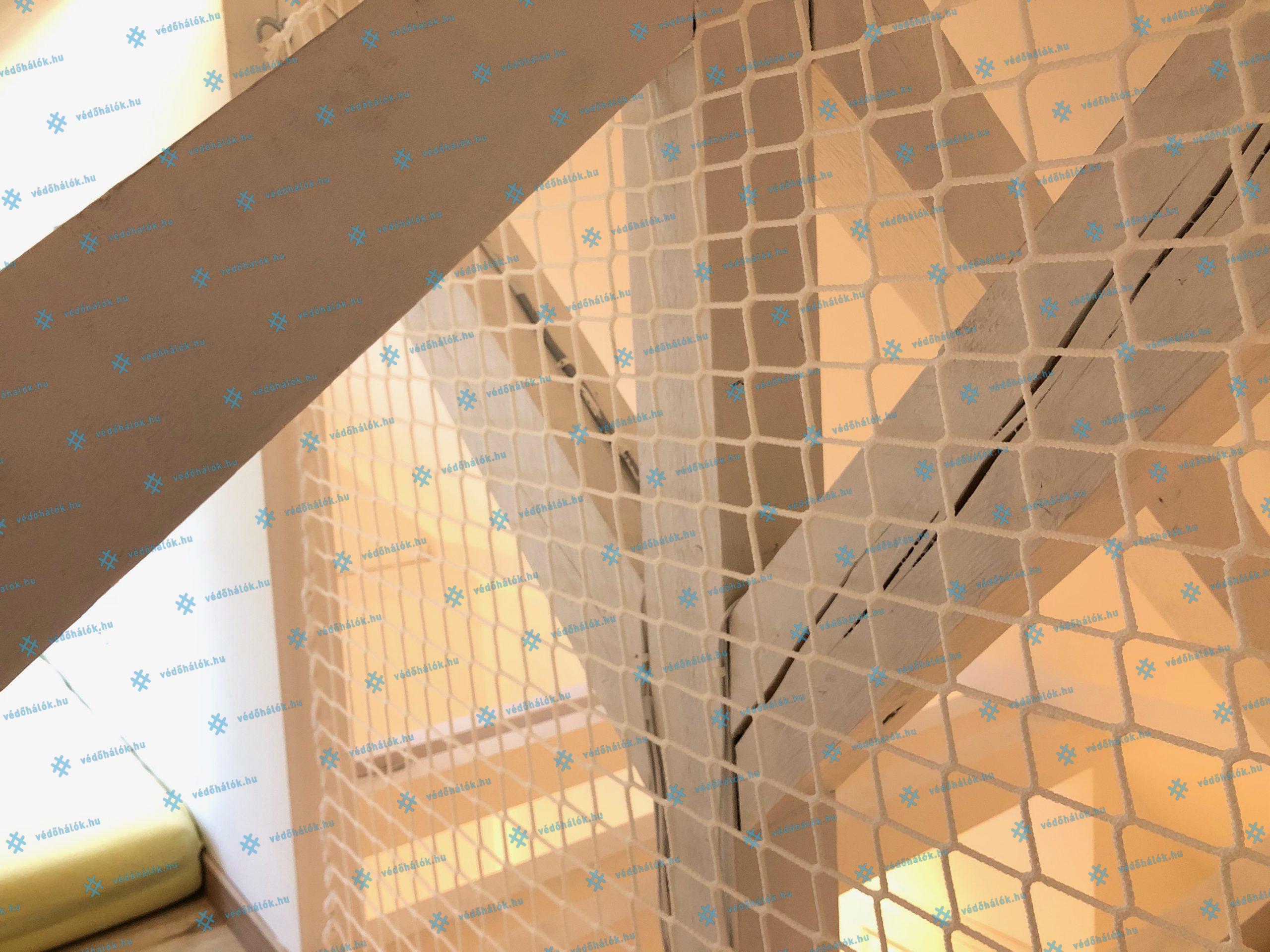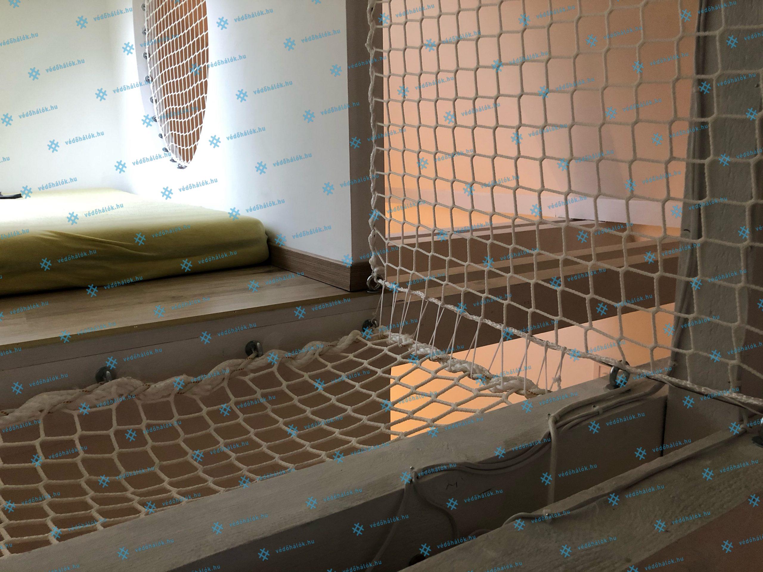 Az egyedi beltéri design kialakítása mellett, a terek biztonságossá tételének a kialakítása is fontos szempont volt. Egy magán lakás legfelső szintjén található, tetőtéri részbe szereltünk fel vízszintesen 5 mm vastag, 45 x 45 mm lyukosztású, fehér színű munkavédelmi hálókat. A függőleges hálók tereket választanak el egymástól, és védenek a leesés, kiesés ellen. Ezek a hálók 3 mm vastag, 45 x 45 mm lyukosztású hálók. Ezekből háromszög és kör alakzat is készült.