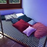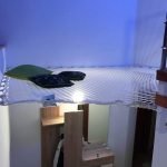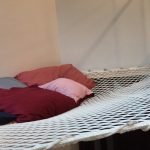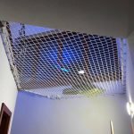 Ebben az esetben a megrendelő egy olyan fehér színű hálót szeretett volna a lépcsőforduló fölé, amiben pihenni, olvasni lehet, és kuckós hatása van. Így az ötletelést követően egy szabálytalan 5 szög alakú hálót gyártottunk és szereltünk fel neki. Ezzel a megoldással egy olyan különleges sarkot hoztunk létre, ahol a család tagok nyugodtan félrevonulhatnak, kikapcsolódhatnak vagy akár az ablakból szemlélődhetnek.