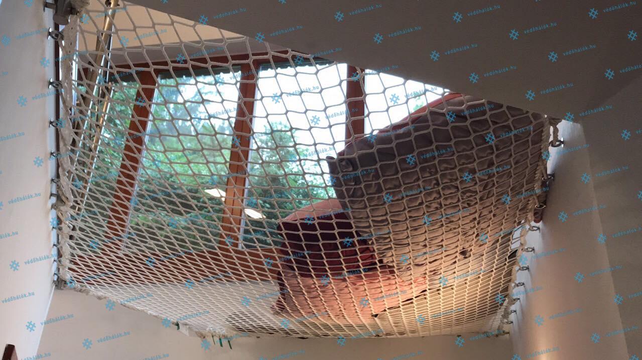 Ebben az esetben a megrendelő egy olyan fehér színű hálót szeretett volna a lépcsőforduló fölé, amiben pihenni, olvasni lehet, és kuckós hatása van. Így az ötletelést követően egy szabálytalan 5 szög alakú hálót gyártottunk és szereltünk fel neki. Ezzel a megoldással egy olyan különleges sarkot hoztunk létre, ahol a család tagok nyugodtan félrevonulhatnak, kikapcsolódhatnak vagy akár az ablakból szemlélődhetnek.